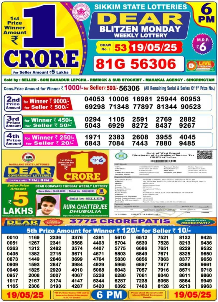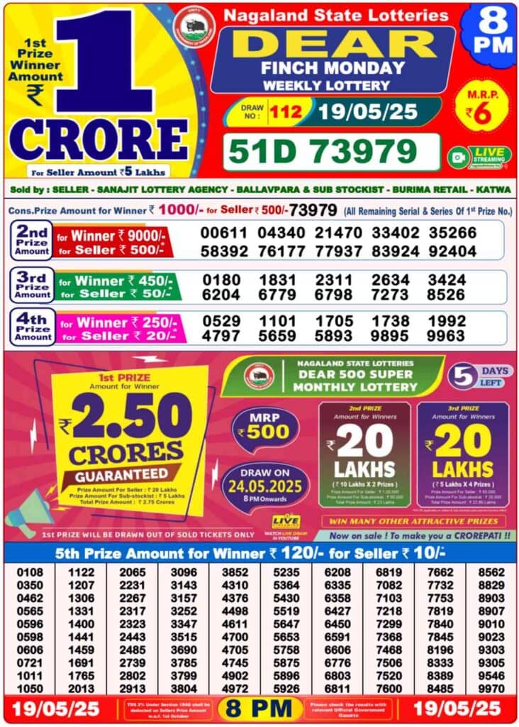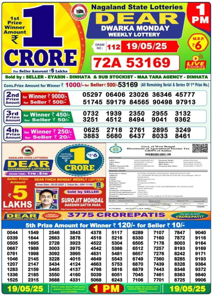 Nagaland State Lottery Monday, 19 May, 2025: The results of Nagaland State Lottery DEAR DWARKA MORNING 1 PM, BLITZEN DAY 6 PM, DEAR FINCH EVENING 8 PM weekly lottery will be declared today i.e. Monday, at 1 PM, 6 PM and 8 PM respectively. To view the list of winners, scroll down.