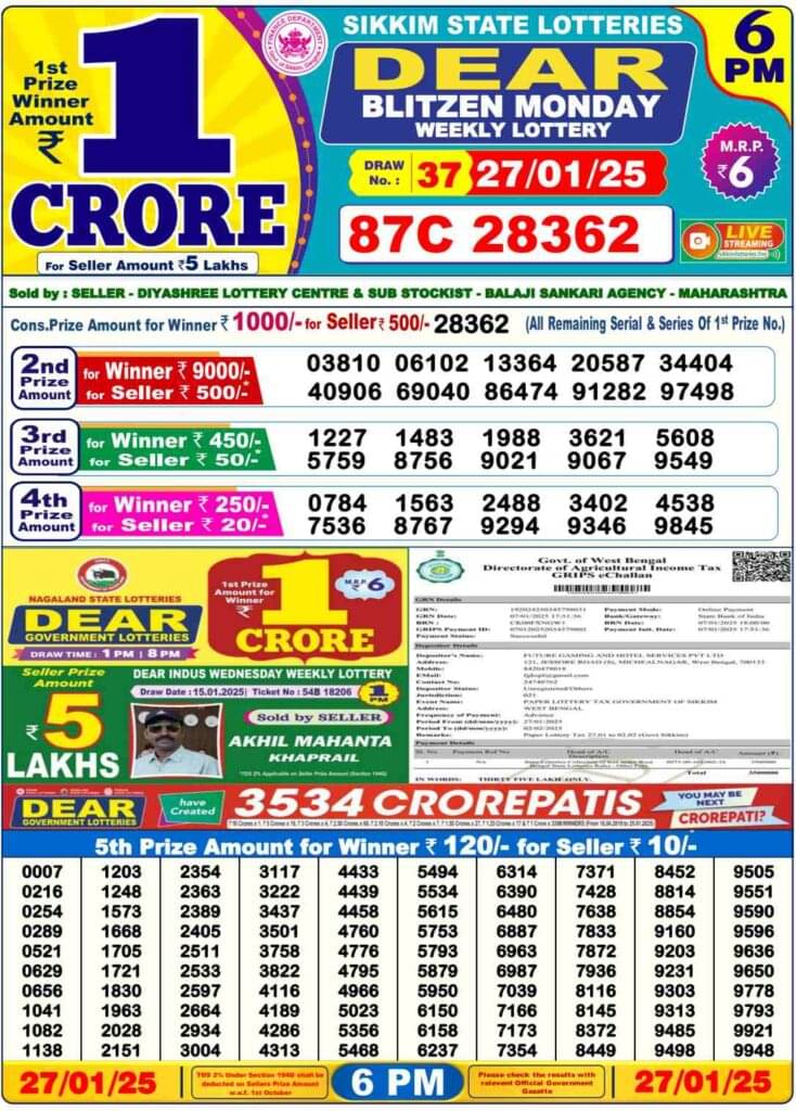 Nagaland State Lottery Monday, 27 January, 2025: The results of Nagaland State Lottery DEAR DWARKA MORNING 1 PM, BLITZEN DAY 6 PM, DEAR FINCH EVENING 8 PM weekly lottery will be declared today i.e. Monday, at 1 PM, 6 PM and 8 PM respectively. To view the list of winners, scroll down.