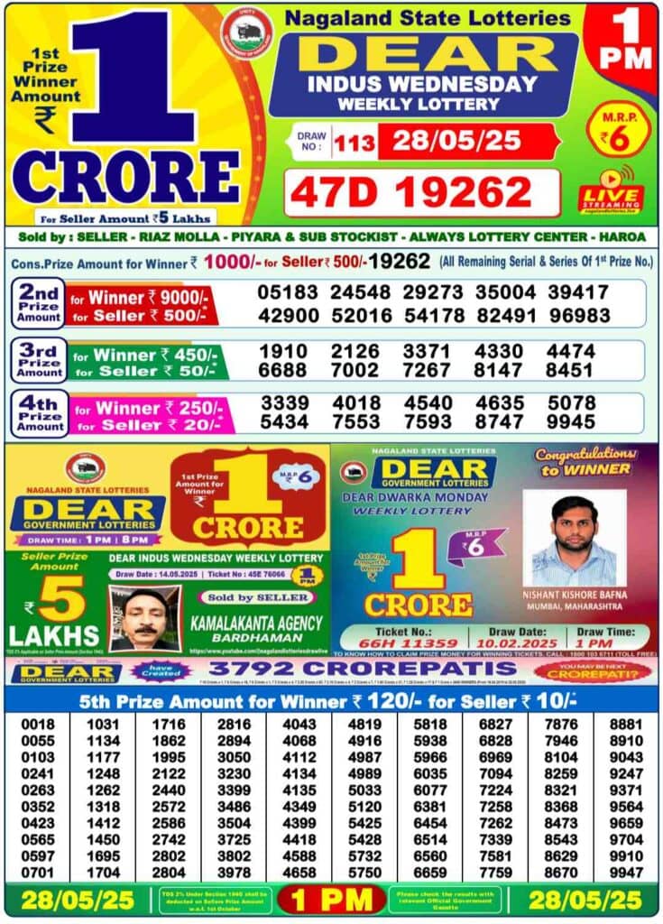 Nagaland Lottery Sambad DEAR DWARKA 1 PM Lucky Winners: 1st Prize Ticket No. 47D 19262