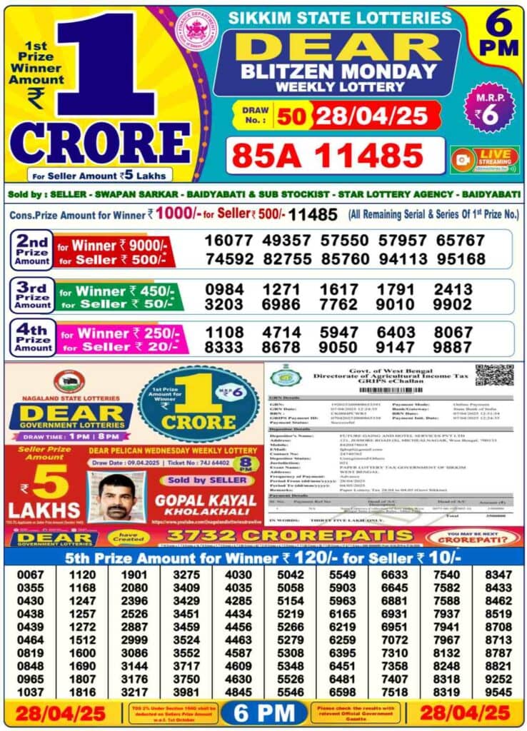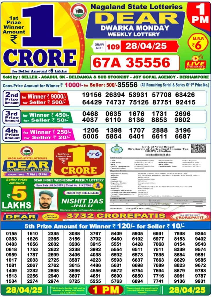 Nagaland State Lottery Monday, 28 Apr, 2025: The results of Nagaland State Lottery DEAR DWARKA MORNING 1 PM, BLITZEN DAY 6 PM, DEAR FINCH EVENING 8 PM weekly lottery will be declared today i.e. Monday, at 1 PM, 6 PM and 8 PM respectively. To view the list of winners, scroll down.