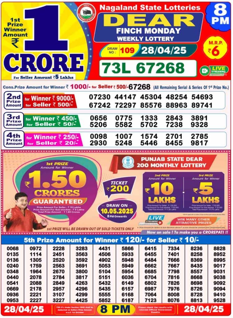 LIVE | Nagaland Lottery (28.04.2025) DEAR FINCH MONDAY 8 PM OUT- 1st Prize Ticket No. 73L 67268