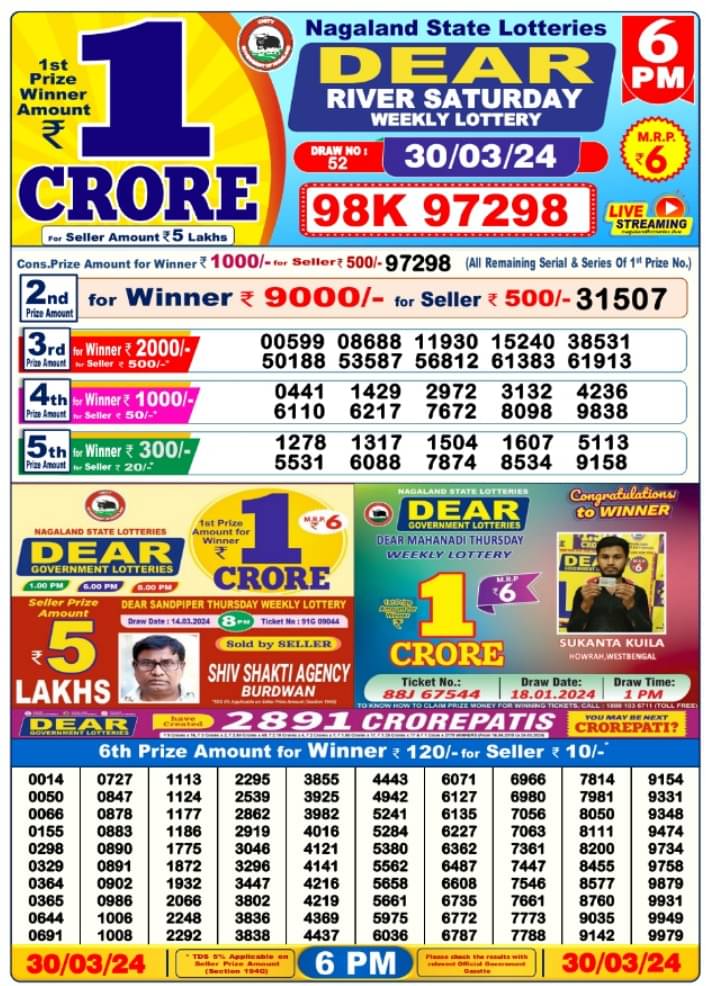 Dear RIVER Saturday 6 PM Lucky Winners: 1st Prize Ticket 98K 97298