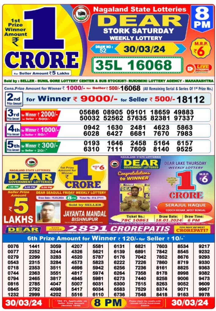 Nagaland Lottery Dear STORK Saturday 8 PM Result Out: 1 CRORE- 1st Prize Winner