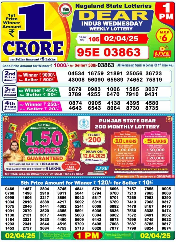 Nagaland State Lottery Results - Wednesday, 02 April 2025: Check Winners for DEAR INDUS MORNING, DEAR CUPID DAY, and DEAR PELICAN EVENING, Nagaland Dear 1 PM Lottery Result 02-04-2025 (OUT): Live updates for Wednesday's Nagaland Sambad State Lottery results. DEAR Morning1 PM, DEAR Evening 6 PM, DEAR Nagaland Lottery 8 PM lottery winners declared today. First Prize: ₹1 Crore. Check the complete winners list now!