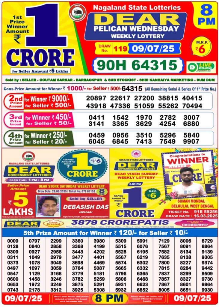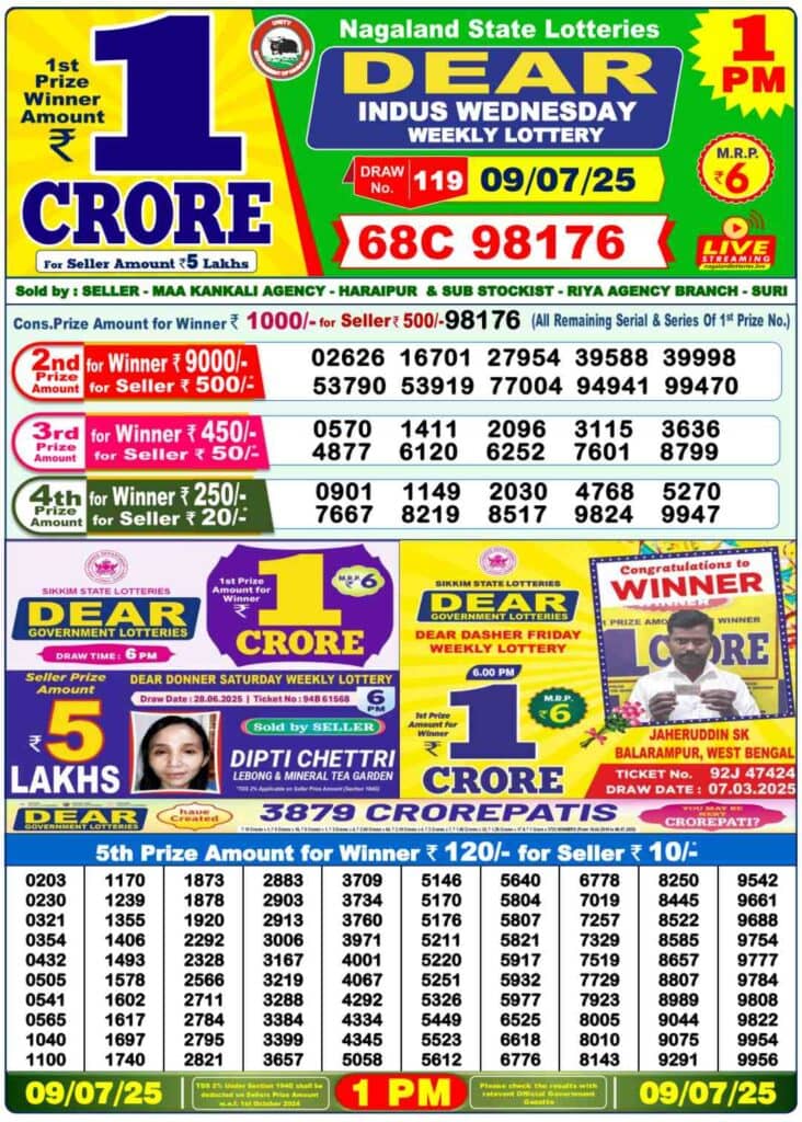 Nagaland State Lottery Results -Wednesday, 09-07-25: Check Winners for DEAR INDUS MORNING, DEAR CUPID DAY, and DEAR PELICAN EVENING, Nagaland Dear 1 PM Lottery Result 02-07-25 (OUT): Live updates for Wednesday's Nagaland Sambad State Lottery results. DEAR Morning1 PM, DEAR Evening 6 PM, DEAR Nagaland Lottery 8 PM lottery winners declared today. First Prize: ₹1 Crore. Check the complete winners list now!