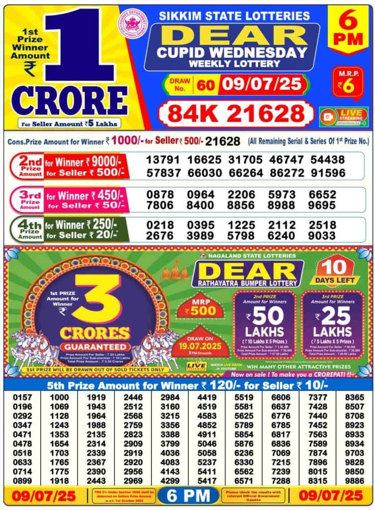 LIVE | Nagaland Lottery Sambad (09-07-25): DEAR CUPID WEDNESDAY 8 PM Result OUT-1st Prize Ticket No 90H 64315