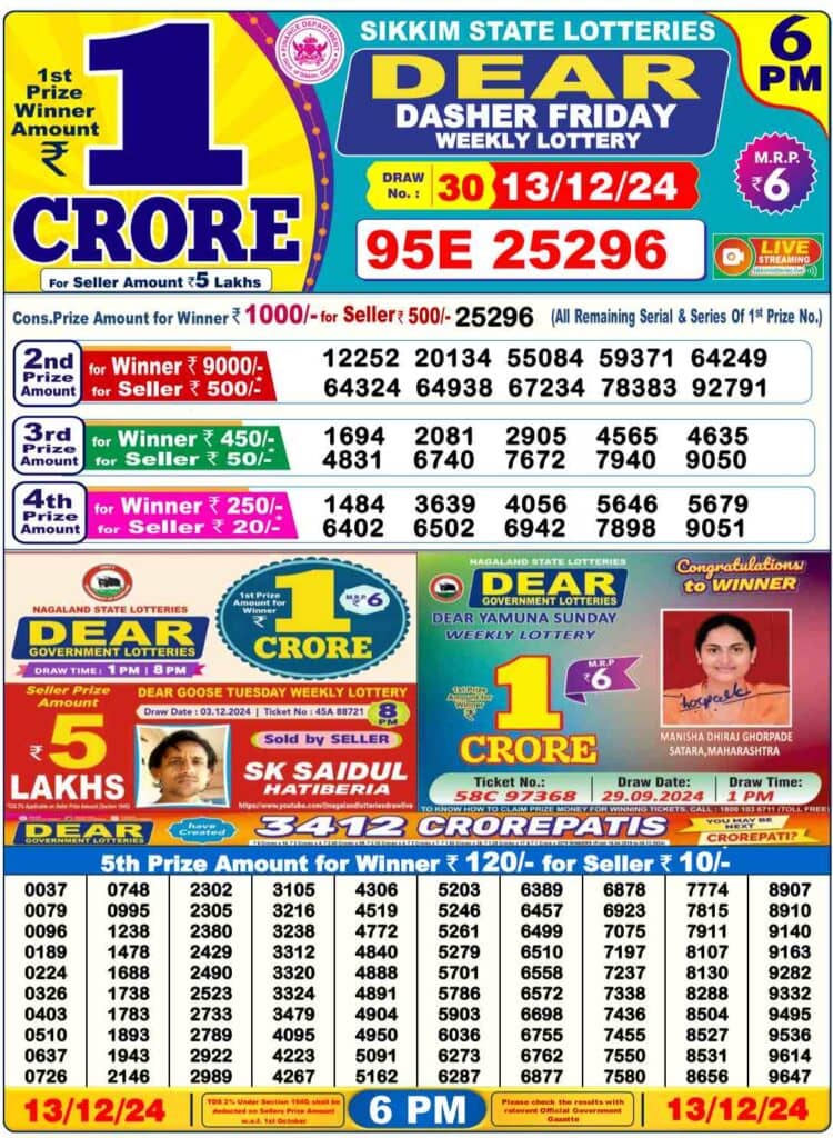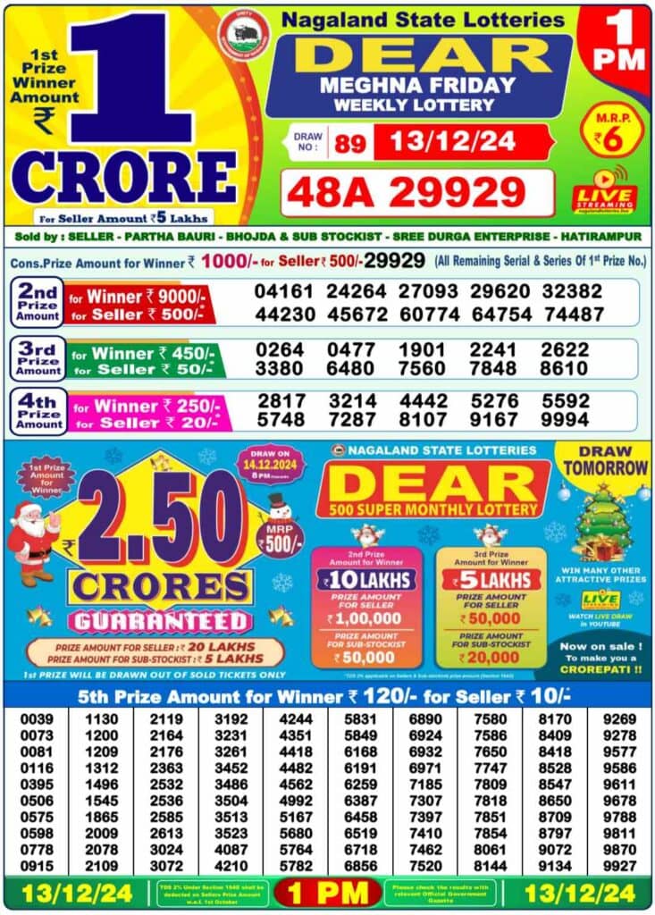 Nagaland State Lottery Friday, 13 December, 2024: The results of Nagaland State Lottery DEAR MEGHNA MORNING 1 PM, DEAR DASHER DAY 6 PM, DEAR SEAGULL EVENING 8 PM weekly lottery will be declared today i.e Friday, at 1 PM, 6 PM and 8 PM respectively. To view the list of winners, scroll down.