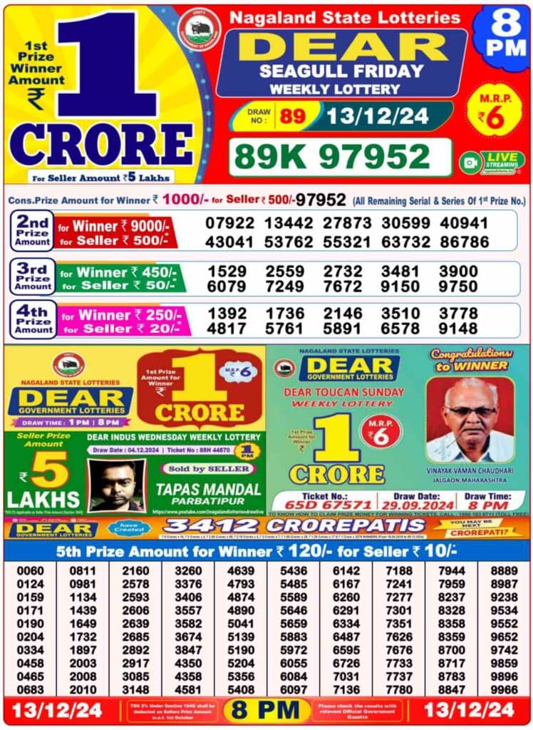 Nagaland Lottery Dear SEAGULL Friday 8PM Evening Lucky Winners: 1st Prize Ticket No. 89K 97952