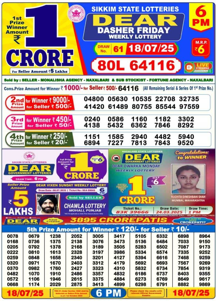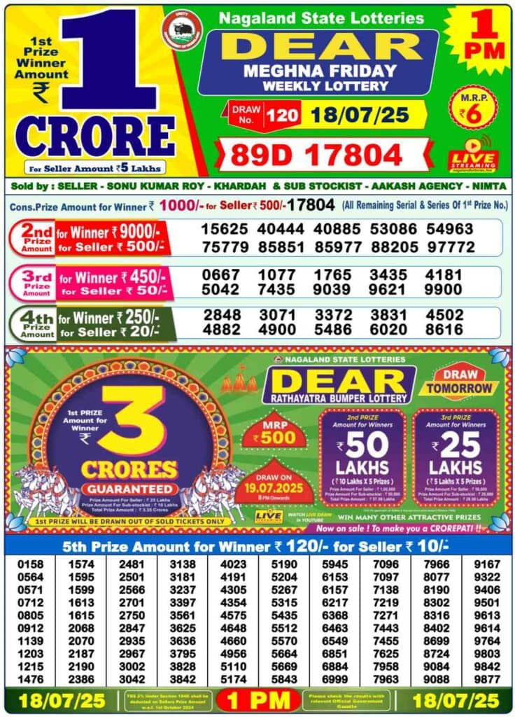 Nagaland State Lottery Friday, 18/07/2025: The results of Nagaland State Lottery DEAR MEGHNA MORNING 1 PM, DEAR DASHER DAY 6 PM, DEAR SEAGULL EVENING 8 PM weekly lottery will be declared today i.e. Friday, at 1 PM, 6 PM and 8 PM respectively. To view the list of winners, scroll down.