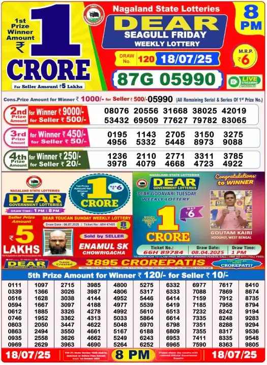 LIVE | Nagaland Lottery Sambad (18/07/2025): DEAR SEAGULL FRIDAY 8 PM Result OUT Now-1st Prize Ticket No 87G 05990