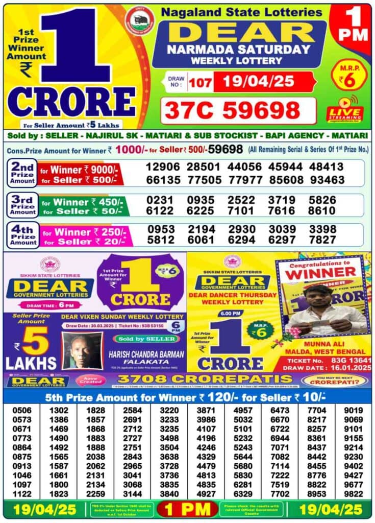 Nagaland Lottery Sambad DEAR NARMADA Saturday Lucky Draw Result ₹80 Lakhs Lucky Number: 1st Prize Ticket No 37C 59698