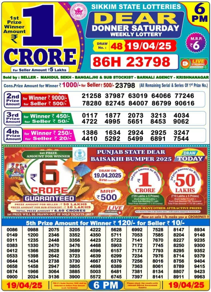 Nagaland Lottery Sambad DEAR DONNER Saturday Lucky Draw Result ₹80 Lakhs Lucky Number: 1st Prize Ticket No. 86H 23798