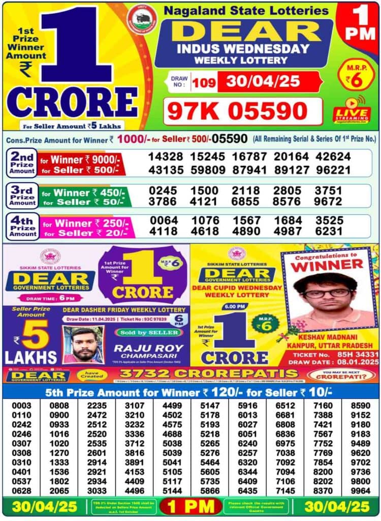 Nagaland State Lottery Results - Wednesday, 30 April 2025: Check Winners for DEAR INDUS MORNING, DEAR CUPID DAY, and DEAR PELICAN EVENING, Nagaland Dear 1 PM Lottery Result 30-04-2025 (OUT): Live updates for Wednesday's Nagaland Sambad State Lottery results. DEAR Morning1 PM, DEAR Evening 6 PM, DEAR Nagaland Lottery 8 PM lottery winners declared today. First Prize: ₹1 Crore. Check the complete winners list now!