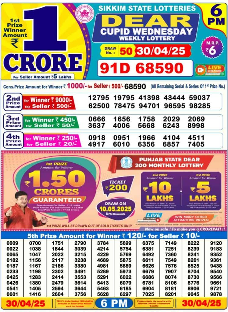 DEAR CUPID WEDNESDAY 6 PM Result OUT-1st Prize Ticket No 91D 68590