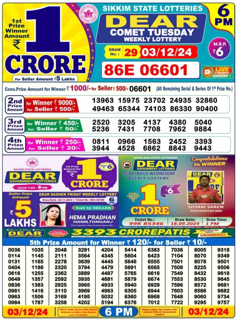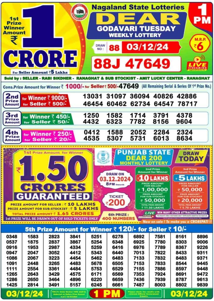 Nagaland State Lottery Tuesday, 3 Dec, 2024: The results of Nagaland State Lottery DEAR GODAVARI MORNING 1 PM, DEAR COMET DAY 6 PM, DEAR GOOSE EVENING 8 PM weekly lottery will be declared today i.e. Tuesday, at 1 PM, 6 PM and 8 PM respectively. To view the list of winners, scroll down.
