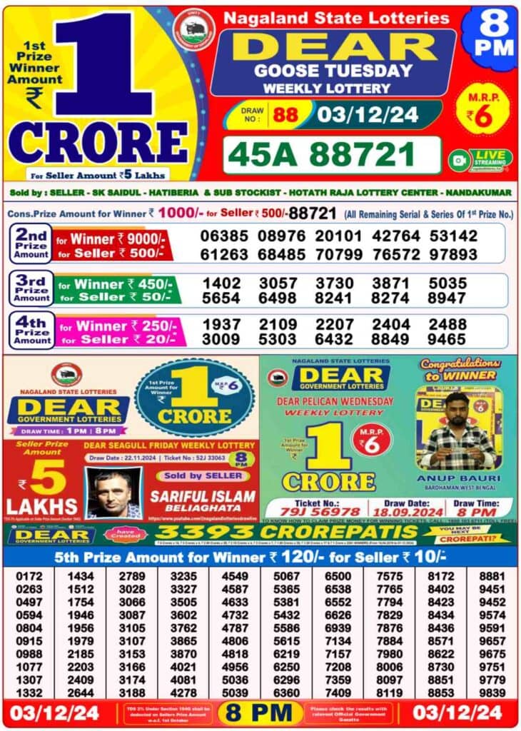 LIVE | Nagaland Lottery Sambad: Dear GOOSE TUESDAY 8 PM Result OUT-1st Prize Ticket No 45A 88721