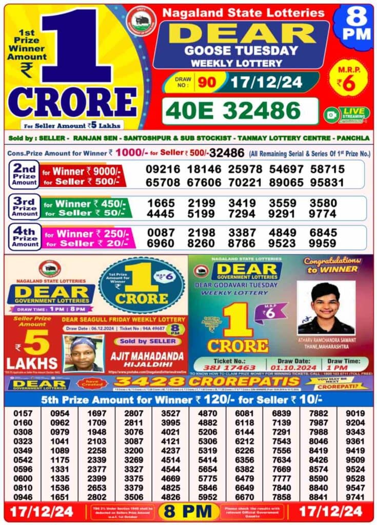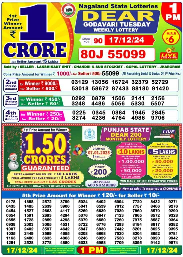 Nagaland State Lottery Results - Tuesday, 17 Dec 2024: Check Winners for DEAR GODAVARI MORNING, DEAR COMET DAY, and DEAR GOOSE EVENING, Nagaland Dear Godavari 1 PM Lottery Result 10-12-2024 (OUT): Live updates for Tuesday's Nagaland Sambad State Lottery results. DEAR GODAVARI 1 PM, DEAR COMET 6 PM, DEAR GOOSE 8 PM lottery winners declared today. Check the complete winners list now!