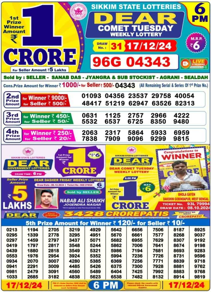 Dear COMET TUESDAY 6 PM Result OUT-1st Prize Ticket No 96G 04343