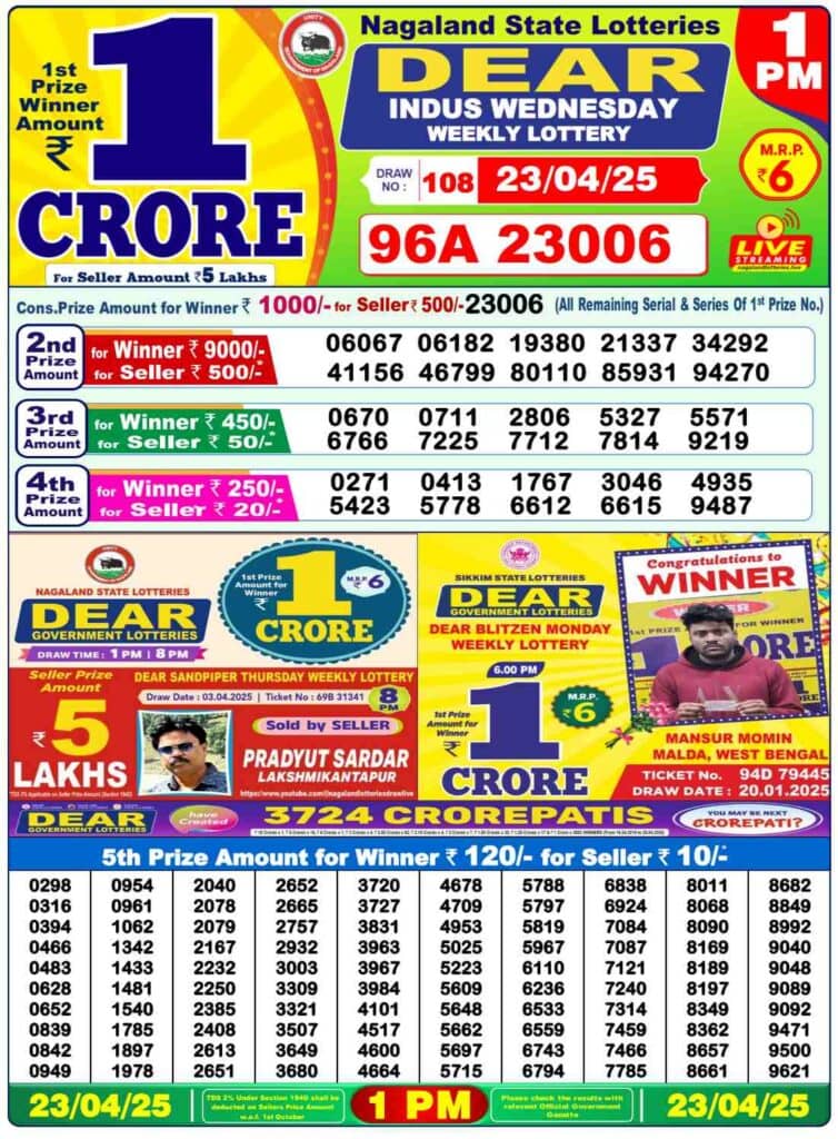 Nagaland State Lottery Results - Wednesday, 23 April 2025: Check Winners for DEAR INDUS MORNING, DEAR CUPID DAY, and DEAR PELICAN EVENING, Nagaland Dear 1 PM Lottery Result 23-04-2025 (OUT): Live updates for Wednesday's Nagaland Sambad State Lottery results. DEAR Morning1 PM, DEAR Evening 6 PM, DEAR Nagaland Lottery 8 PM lottery winners declared today. First Prize: ₹1 Crore. Check the complete winners list now!