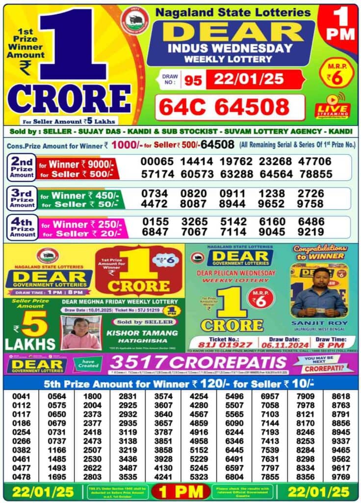 Nagaland State Lottery Results - Tuesday, 22 Jan 2025: Check Winners for DEAR INDUS MORNING, DEAR CUPID DAY, and DEAR PELICAN EVENING, Nagaland Dear 1 PM Lottery Result 22-01-2025 (OUT): Live updates for Tuesday's Nagaland Sambad State Lottery results. DEAR Morning1 PM, DEAR Evening 6 PM, DEAR Nagaland Lottery 8 PM lottery winners declared today. First Prize: ₹1 Crore. Check the complete winners list now!