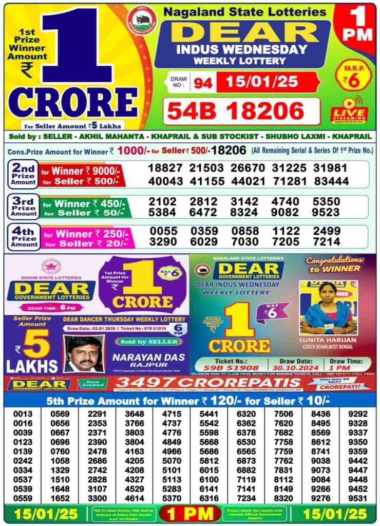 Nagaland State Lottery Results - Tuesday, 15 Jan 2025: Check Winners for DEAR INDUS MORNING, DEAR CUPID DAY, and DEAR PELICAN EVENING, Nagaland Dear 1 PM Lottery Result 15-01-2025 (OUT): Live updates for Tuesday's Nagaland Sambad State Lottery results. DEAR Morning1 PM, DEAR Evening 6 PM, DEAR Nagaland Lottery 8 PM lottery winners declared today. First Prize: ₹1 Crore. Check the complete winners list now!