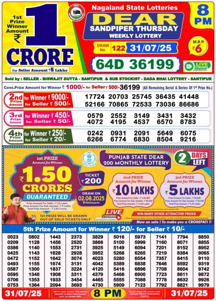 LIVE | Nagaland Lottery Sambad: DEAR SANDPIPER (31-07-2025) Thursday 8 PM Result OUT-1st Prize Ticket No 64D 36199