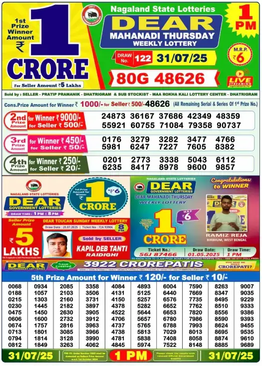 Nagaland Lottery DEAR MAHANADI Thursday 1 PM Result OUT 1st Prize number: 80G 48626
