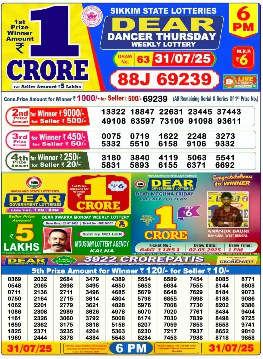 Nagaland Lottery Sambad DEAR DANCER: 1st Prize Ticket No. 88J 69239