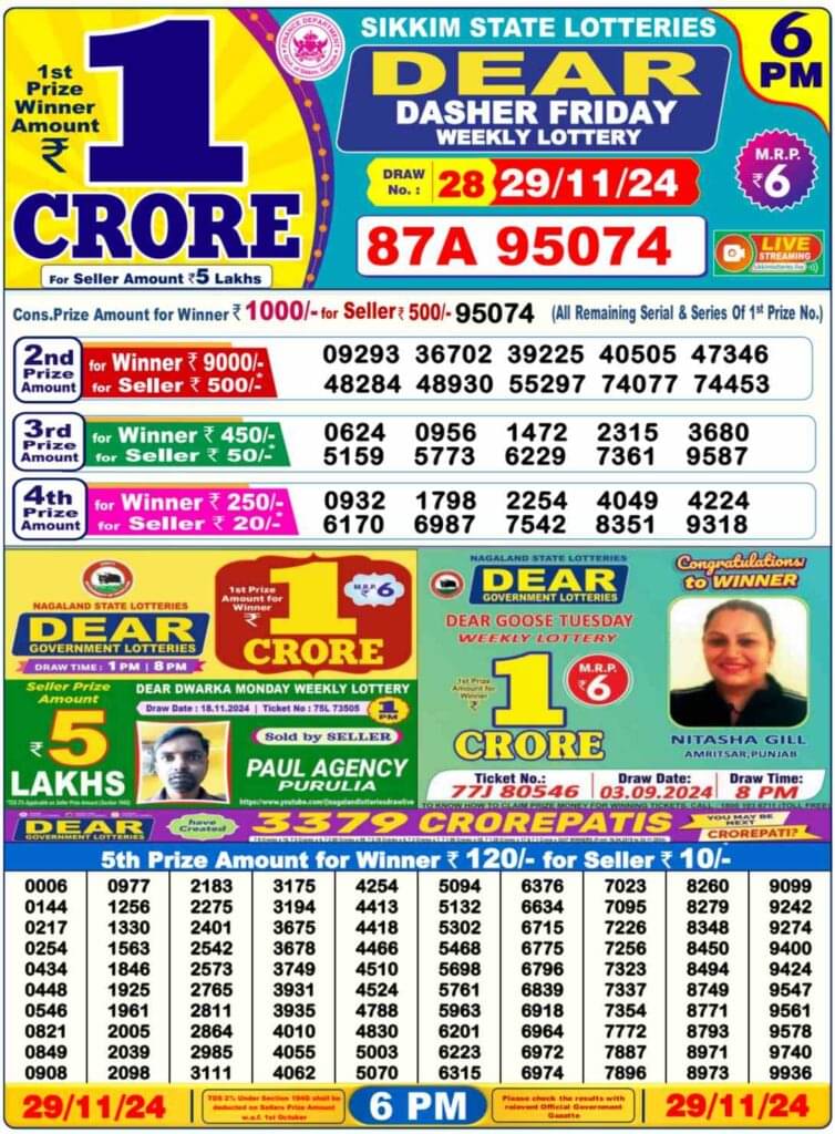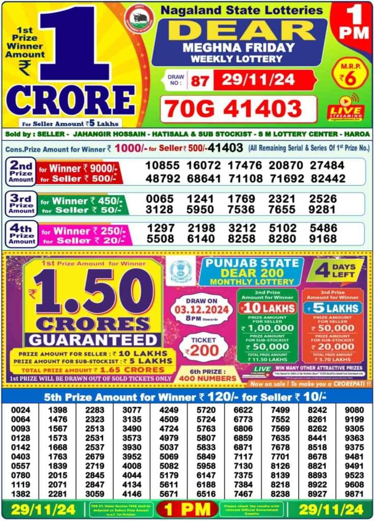 Nagaland State Lottery Friday, 29 November, 2024: The results of Nagaland State Lottery DEAR MEGHNA MORNING 1 PM, DEAR DASHER DAY 6 PM, DEAR SEAGULL EVENING 8 PM weekly lottery will be declared today i.e Friday, at 1 PM, 6 PM and 8 PM respectively. To view the list of winners, scroll down.