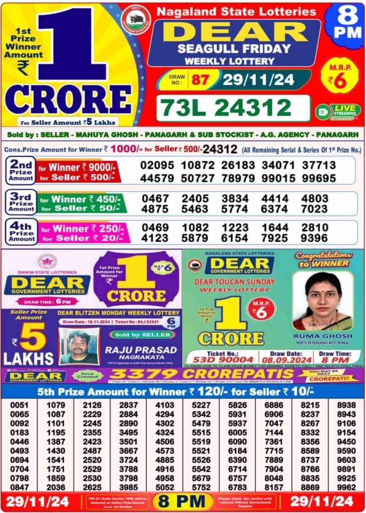 LIVE | Nagaland Lottery Sambad: DEAR SEAGULL Friday 8 PM Result Out-1st Prize Ticket No. 73L 24312
