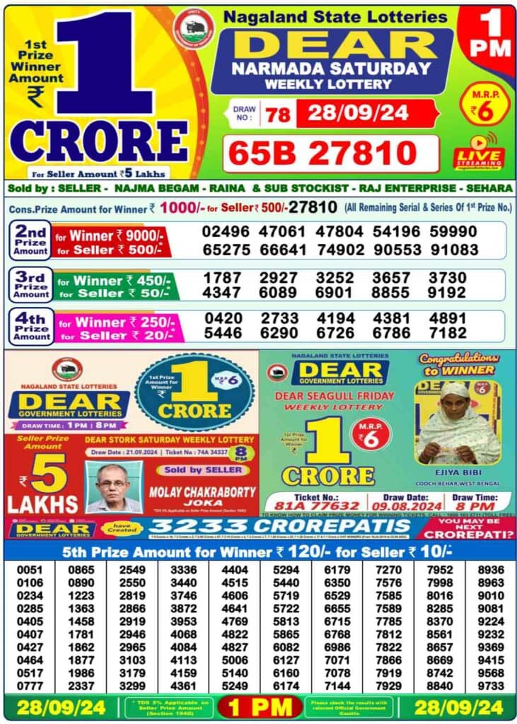 Nagaland Dear NARMADA Saturday Lucky Draw Result ₹80 Lakhs Lucky Number - : 1st Prize Ticket No. 65B 27810