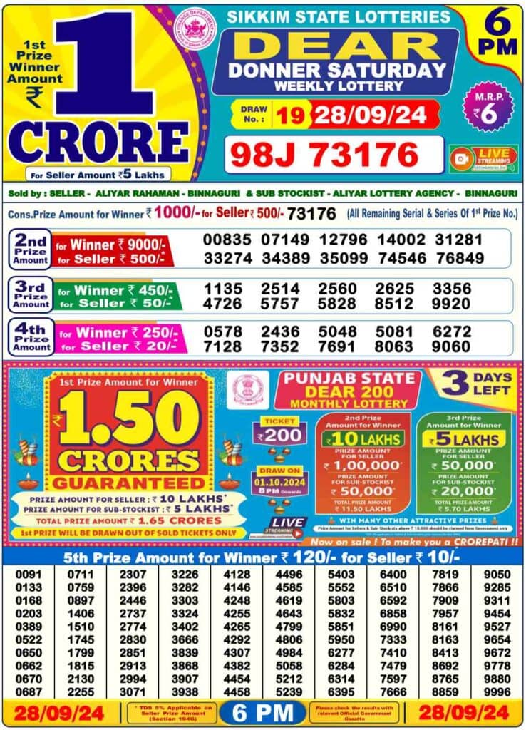 Nagaland Dear DONNER Saturday Lucky Draw Result ₹80 Lakhs Lucky Number: 1st Prize Ticket No. 96A 64120