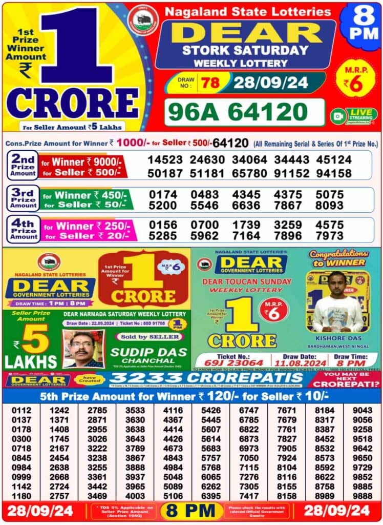 Nagaland Dear STORK Saturday Lucky Draw Result ₹80 Lakhs Lucky Number: 1st Prize Ticket No. 96A 64120