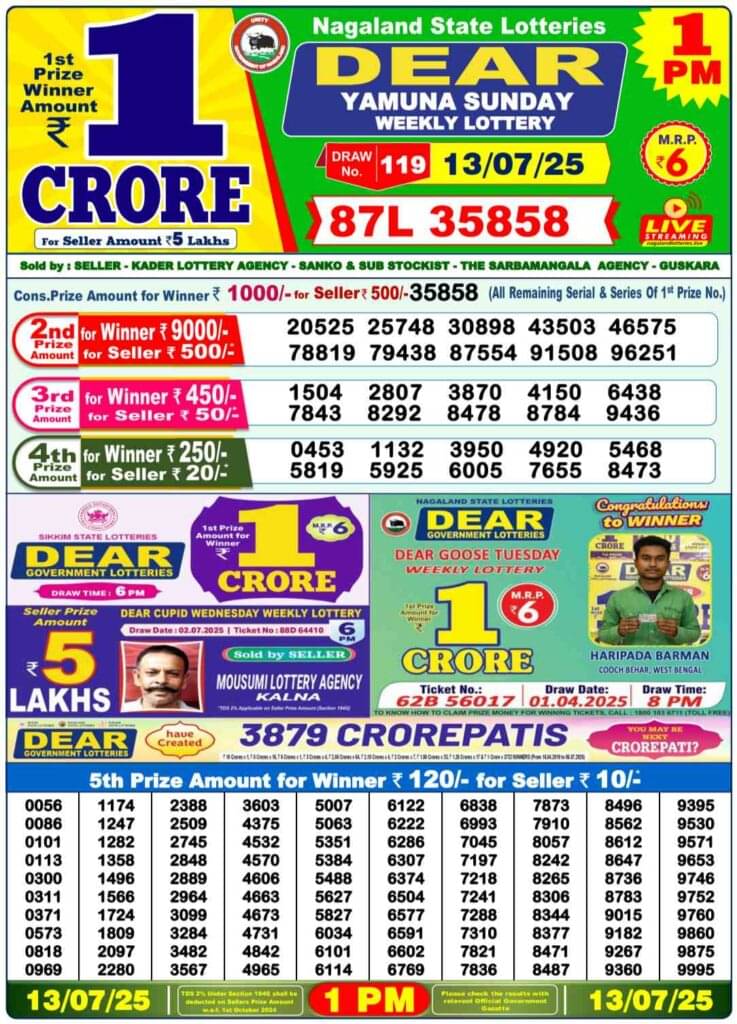 Nagaland Sambad Lottery DEAR YAMUNA SUNDAY 1 PM Lucky Winner: 1st Prize Ticket No. 87L 35858