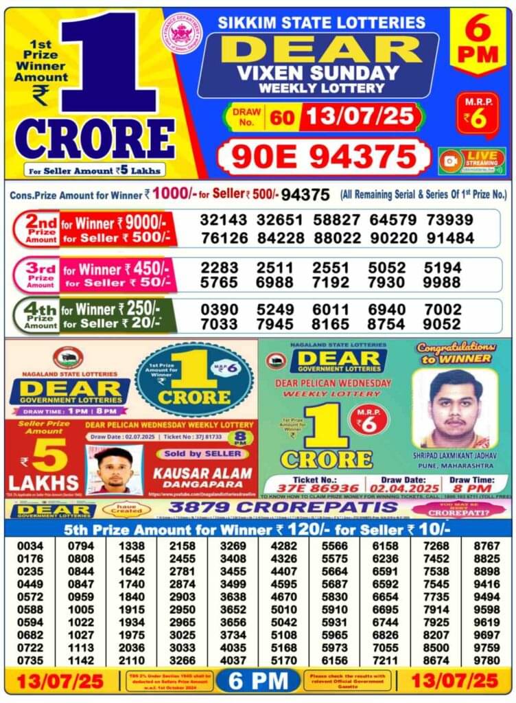 Nagaland Lottery DEAR VIXEN SUNDAY 6 PM Result Out: 1st Prize Winner no. 90E 94375