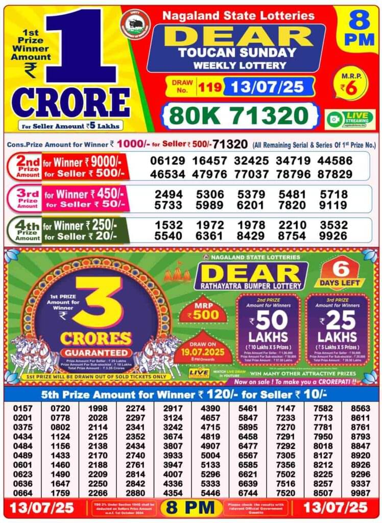 Nagaland State Lottery Sunday, 13.07.2025: The results of Nagaland State Lottery DEAR YAMUNA MORNING 1 PM, DEAR VIXEN 6 PM, DEAR TOUCAN NIGHT 8 PM weekly lottery will be declared today i.e Sunday, at 1 PM, 6 PM and 8 PM respectively. Scroll down below to check Nagaland State Lottery Sunday draw.