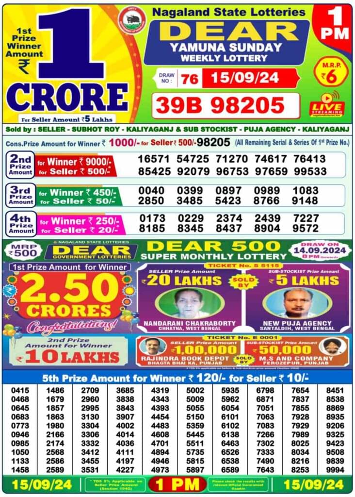 Nagaland DEAR YAMUNA Morning 1 PM Result: 1st Prize winner no. 39B 98205