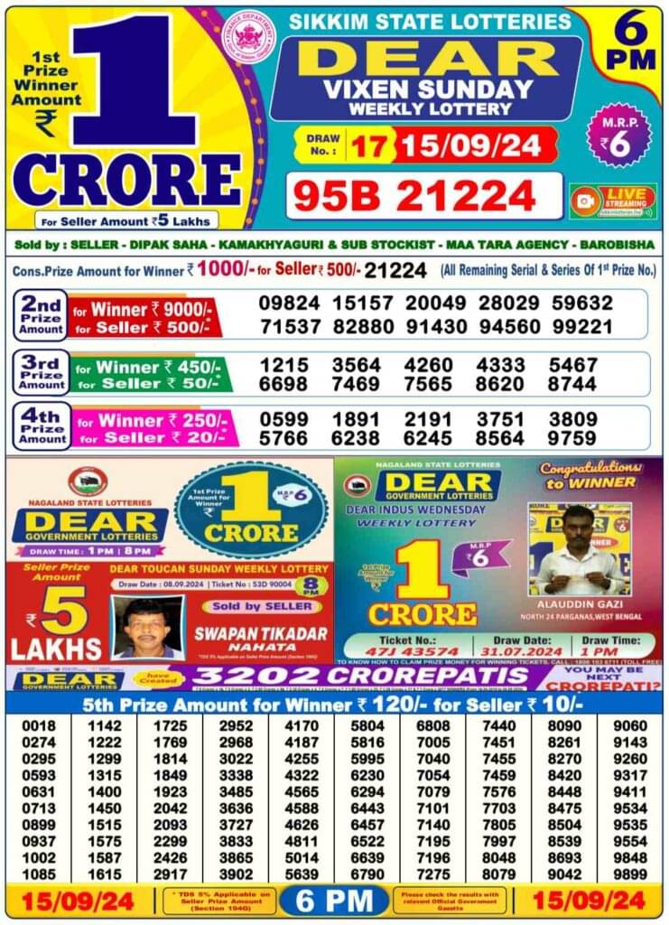 Nagaland Lottery Dear VIXENSUNDAY 6 PM Result Out: 1 Crore - 1st Prize Winner