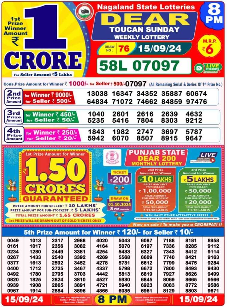 LIVE Nagaland Lottery Sambad Result Today (15.09.2024): DEAR TOUCAN SUNDAY 8 PM 1st Prize 59L 07097