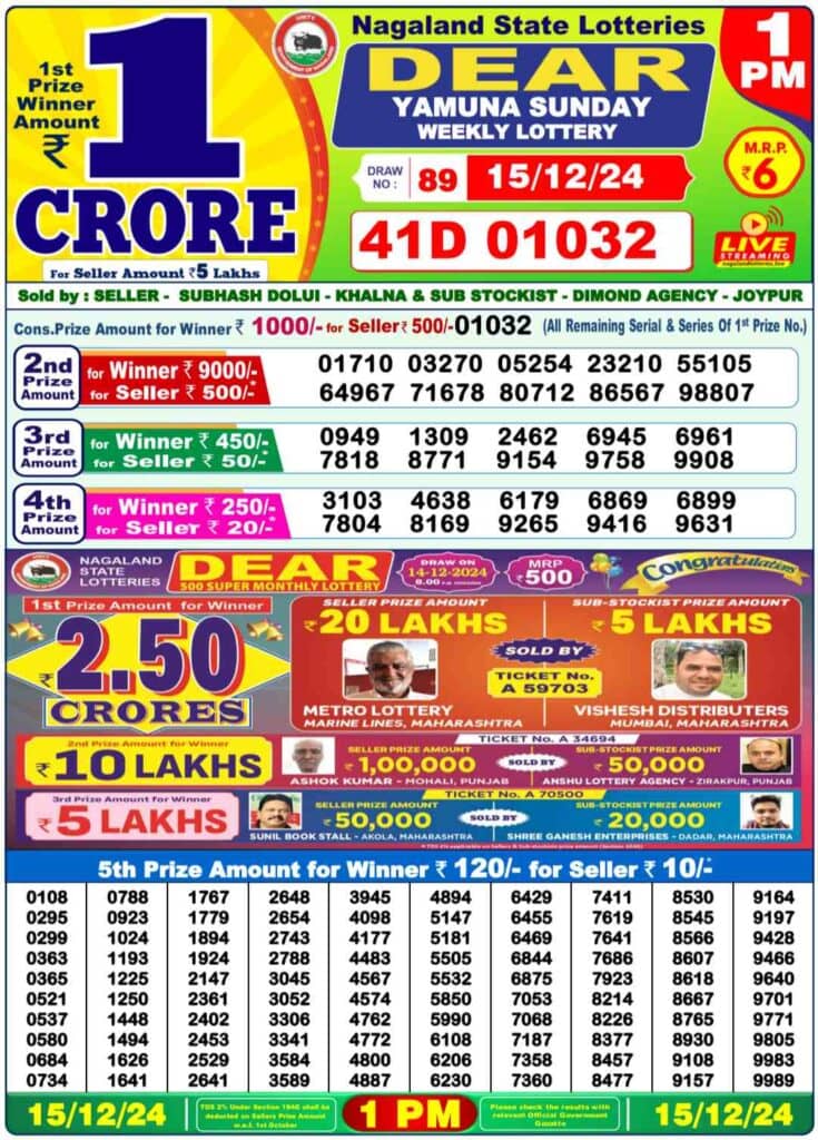 Nagaland Lottery Dear YAMUNA YAMUNA SUNDAY 1 PM Lucky Winner: 1st Prize Ticket No. 41D 01032