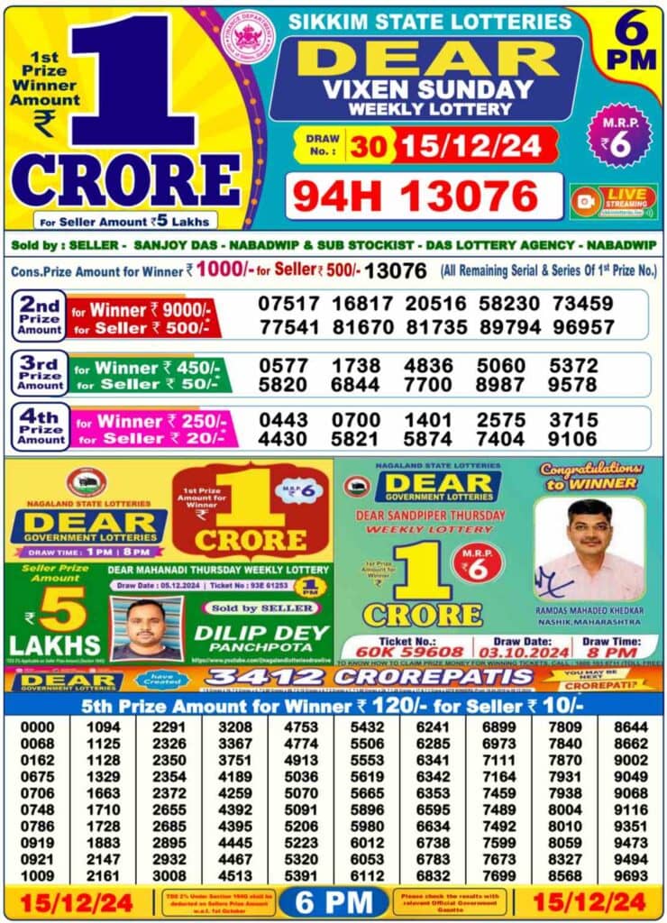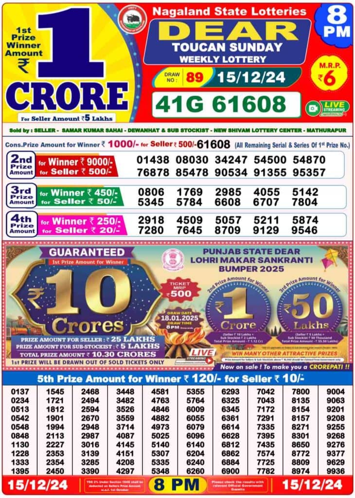 Nagaland State Lottery Sunday, 15 Dec, 2024: The results of Nagaland State Lottery DEAR YAMUNA MORNING 1 PM, DEAR VIXEN 6 PM, DEAR TOUCAN NIGHT 8 PM weekly lottery will be declared today i.e Sunday, at 1 PM, 6 PM and 8 PM respectively. To view the list of Nagaland State Lottery Sunday winners list, scroll up.