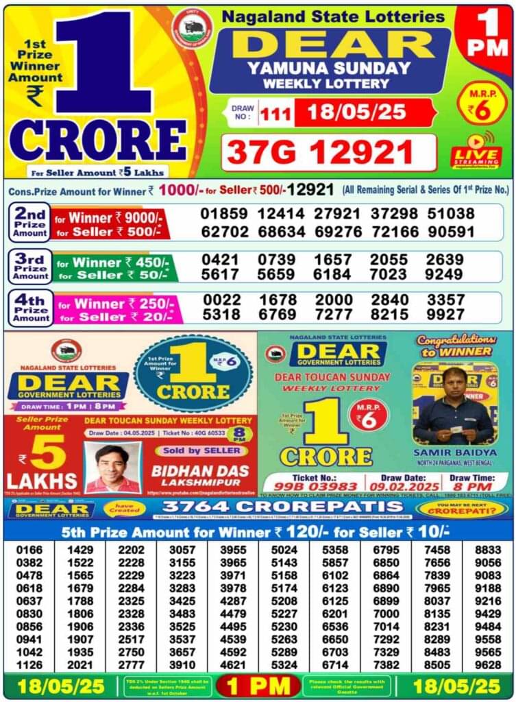 Nagaland State Lottery Sunday, 18 May, 2025: The results of Nagaland State Lottery DEAR YAMUNA MORNING 1 PM, DEAR VIXEN 6 PM, DEAR TOUCAN NIGHT 8 PM weekly lottery will be declared today i.e Sunday, at 1 PM, 6 PM and 8 PM respectively.