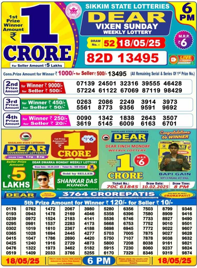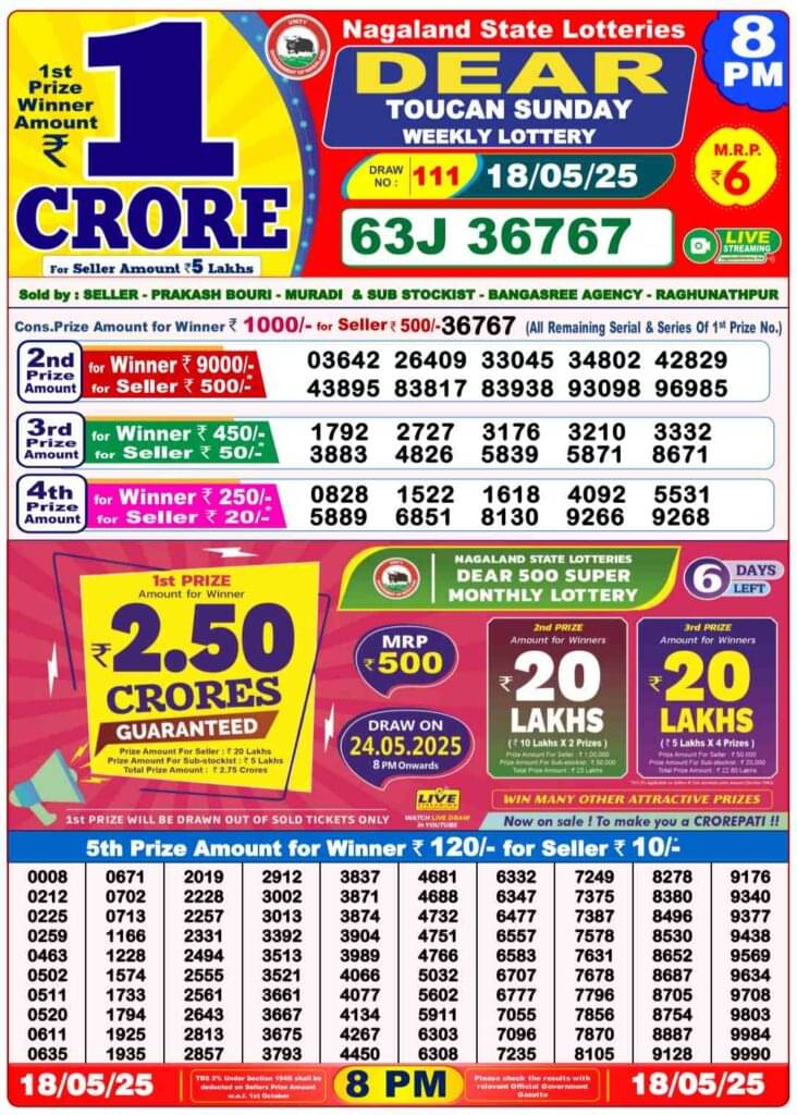 Nagaland State Lottery Sunday, 18 May, 2025: The results of Nagaland State Lottery DEAR YAMUNA MORNING 1 PM, DEAR VIXEN 6 PM, DEAR TOUCAN NIGHT 8 PM weekly lottery will be declared today i.e Sunday, at 1 PM, 6 PM and 8 PM respectively. Scroll down below to check Nagaland State Lottery Sunday draw.