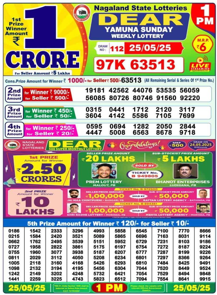 Nagaland Lottery DEAR YAMUNA Sunday 1 PM Result Out: 1 Crore - 1st Prize Winner