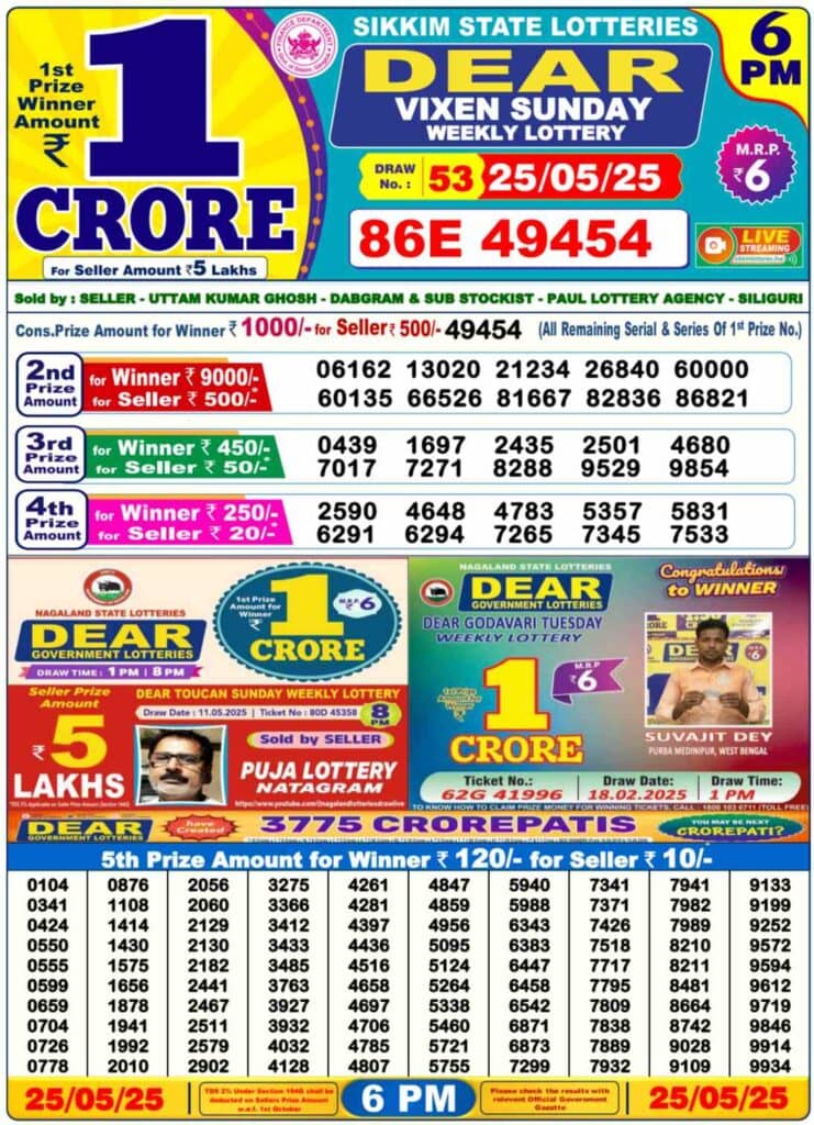 Nagaland Lottery Sunday result, 25 May, 2025: The results of Nagaland State Lottery DEAR YAMUNA MORNING 1 PM, DEAR VIXEN 6 PM, DEAR TOUCAN NIGHT 8 PM weekly lottery will be declared today i.e Sunday, at 1 PM, 6 PM and 8 PM respectively. Scroll down below to check Nagaland State Lottery Sunday draw.