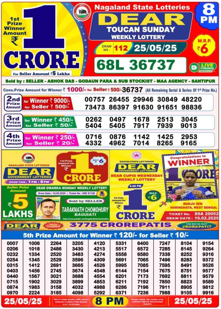 LIVE| Nagaland Lottery Sambad Result Today (25.05.2025): DEAR TOUCAN SUNDAY 8 PM Winner Ticket No. 68L 36737