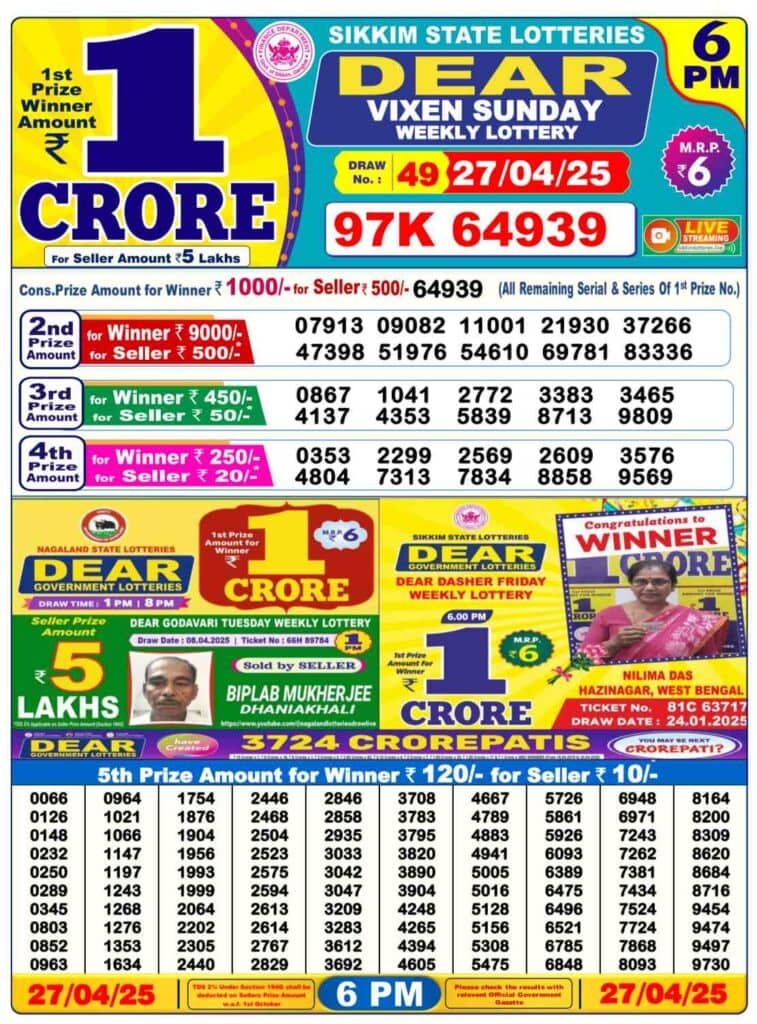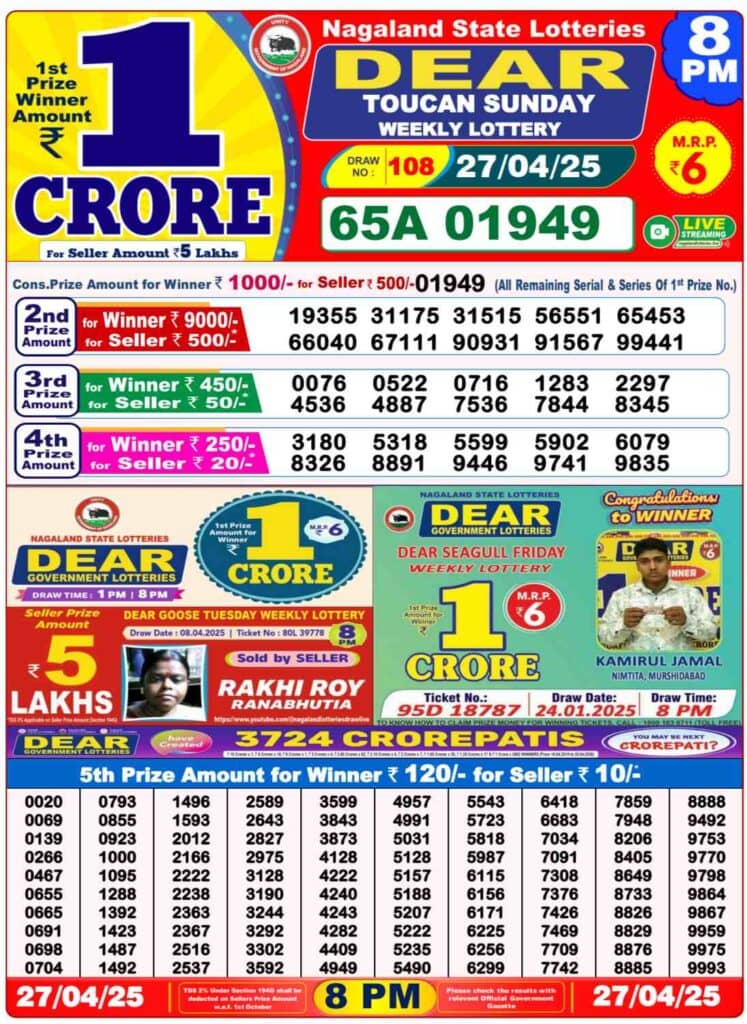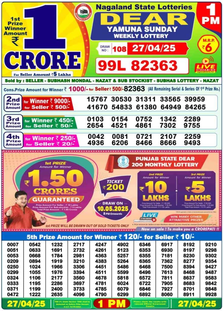 Nagaland State Lottery Sunday, 27 Apr, 2025: The results of Nagaland State Lottery DEAR YAMUNA MORNING 1 PM, DEAR VIXEN 6 PM, DEAR TOUCAN NIGHT 8 PM weekly lottery will be declared today i.e Sunday, at 1 PM, 6 PM and 8 PM respectively. Scroll down below to check Nagaland State Lottery Sunday draw.