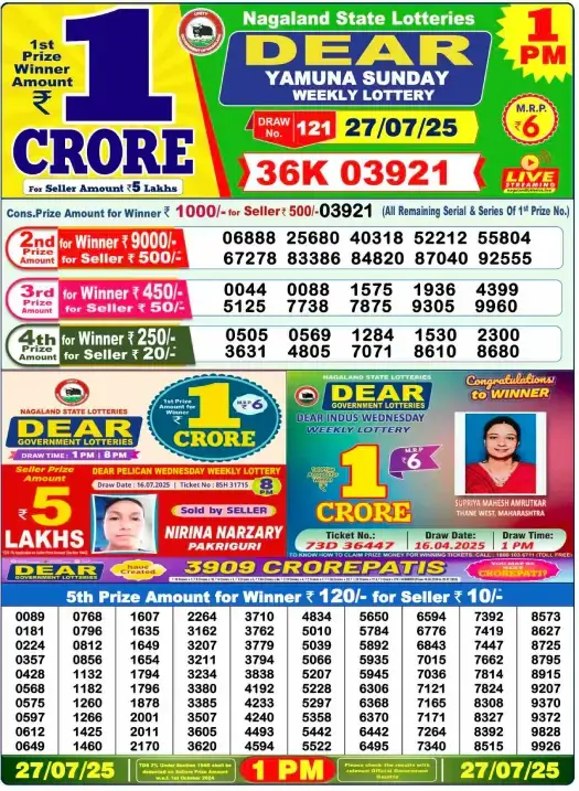 Nagaland Lottery DEAR YAMUNA Sunday 1 PM Result Out: 1 Crore - 1st Prize Winner