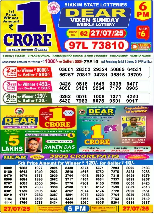 LIVE| Nagaland Lottery Sambad Result Today (27.07.2025) DEAR VIXEN SUNDAY 6 PM Result First Prize Ticket No. 97L 73810