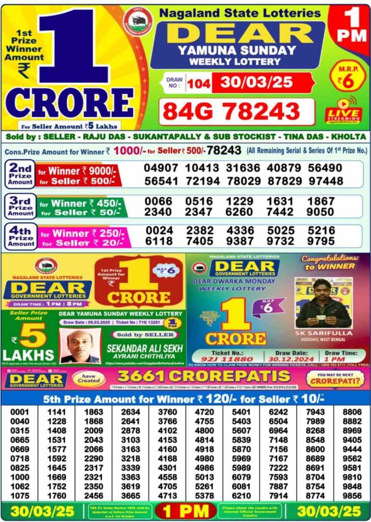 LIVE| Nagaland Lottery Sambad Result Today (30.03.2025) DEAR YAMUNA SUNDAY 1 PM Ticket No. 84G 78243